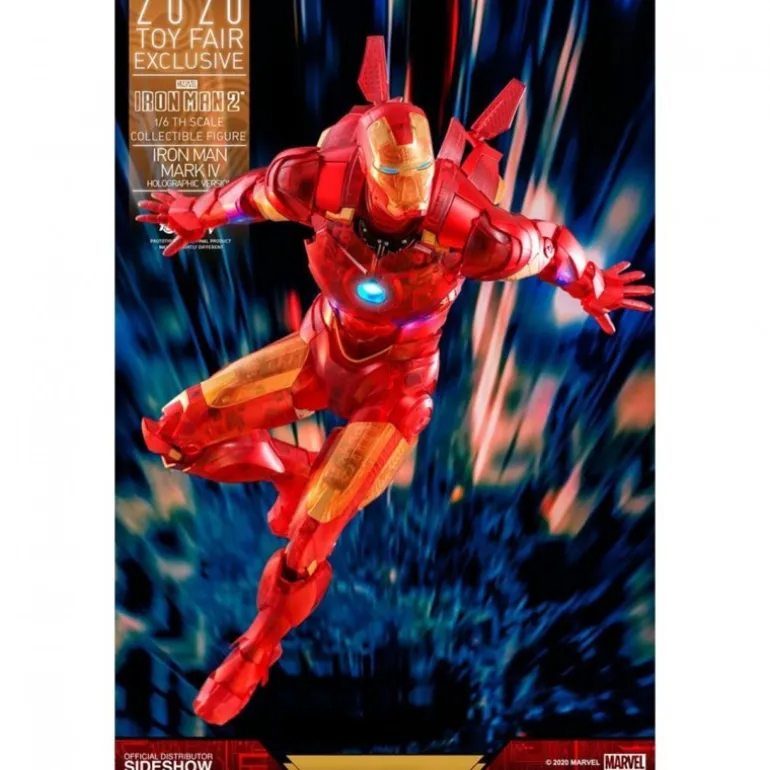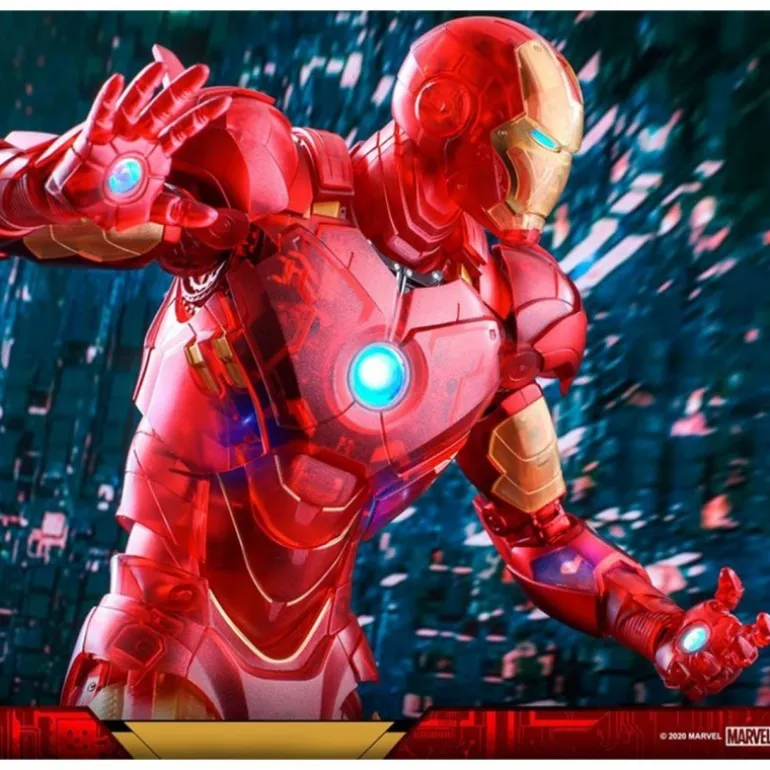 La armadura holográfica en tonos rojos y dorados ofrece un atractivo visual inigualable, con partes transparentes que simulan un efecto de luz y tecnología avanzada. Fabricada por la reconocida marca HOT TOYS, garantiza calidad y autenticidad, siendo una pieza imprescindible para cualquier coleccionista serio.