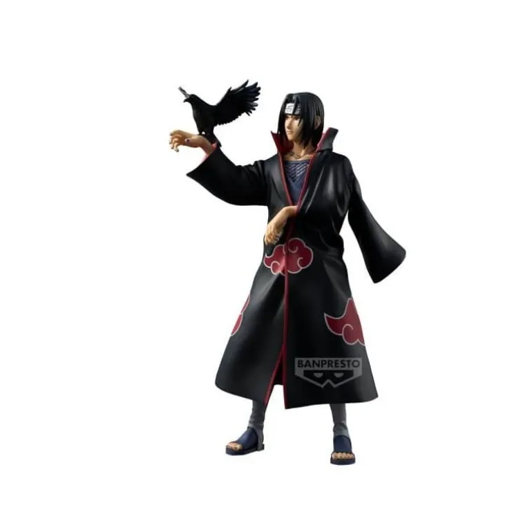 La figura presenta a Itachi Uchiha con su característico abrigo de Akatsuki, decorado con nubes rojas sobre un fondo negro. La atención al detalle es excepcional, cada pliegue y característica del traje está meticulosamente realizado. Itachi se muestra en una pose serena y majestuosa, con un cuervo posado en su brazo, capturando su naturaleza misteriosa y formidable.