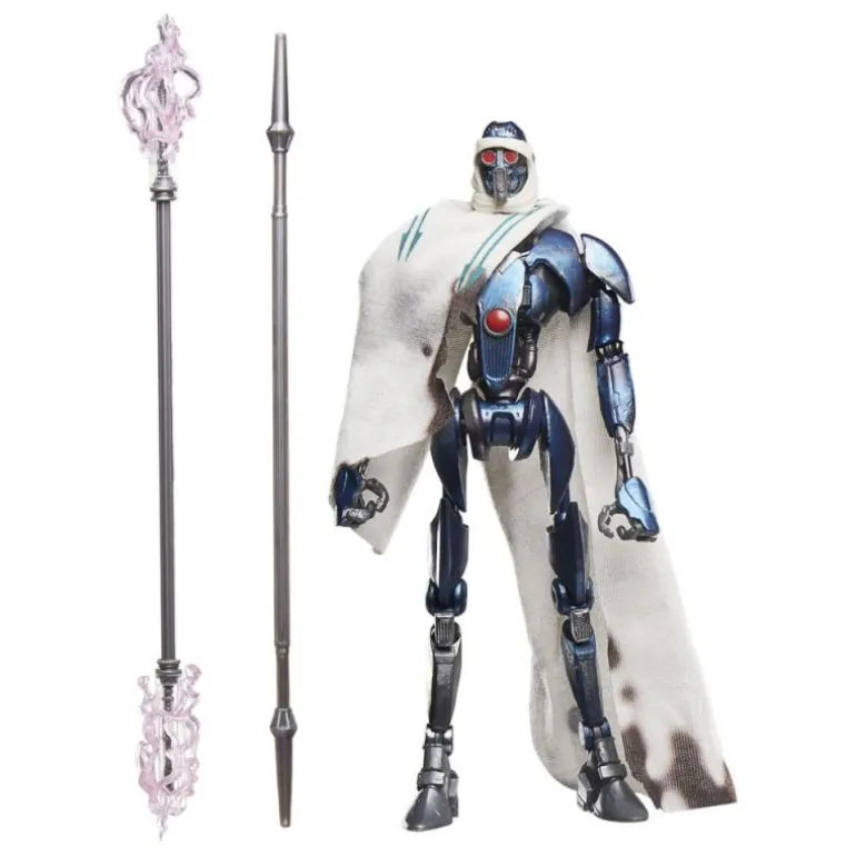 Descubre la impresionante figura articulada del Magnaguard de Star Wars, parte de la exclusiva colección Black Series 20th Anniversary de Hasbro. Esta figura de 15 cm captura con detalle al emblemático guardaespaldas droide visto en el Episodio III. Con un diseño fiel a la película, presenta un acabado metálico en azul oscuro y un manto de tela realista que añade autenticidad. Su lanza electrostaff, con efectos de energía morada, aporta un toque dinámico y permite recrear escenas de combate vibrantes.