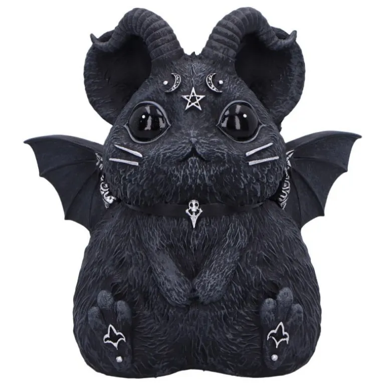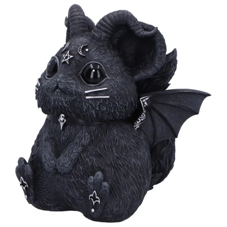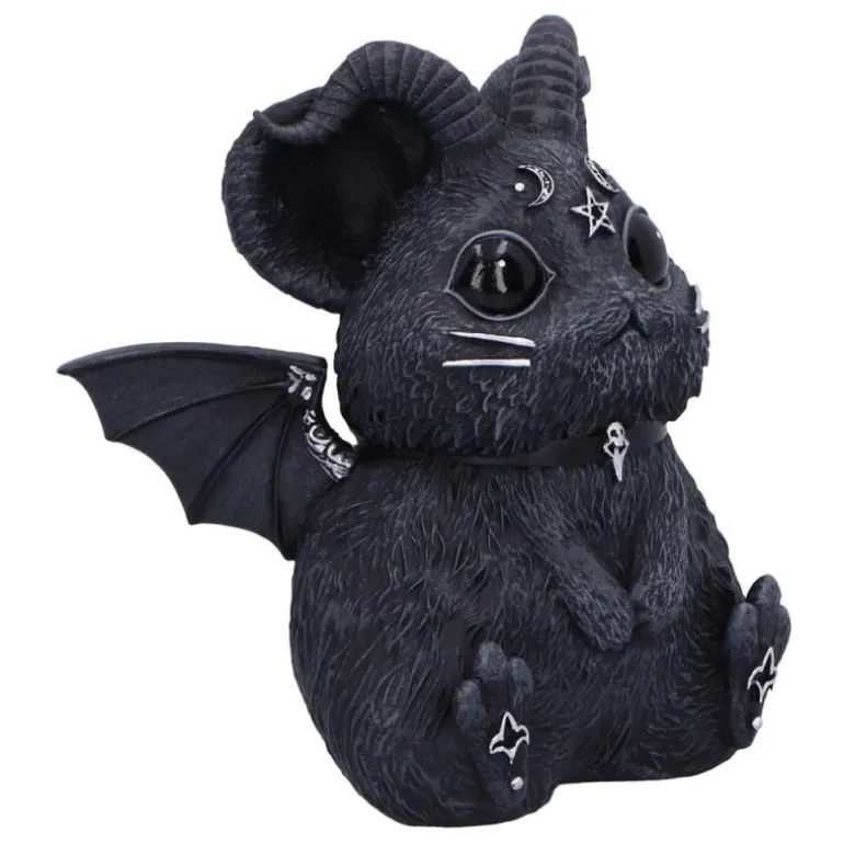 El diseño presenta una criatura encantadora parecida a un hamster o una chinchilla, con cuernos rizados, grandes orejas y ojos expresivos. Su pelaje texturizado y ala con estilo gótico agrega un toque de oscuridad intrigante. Los detalles de la cara incluyen símbolos esotéricos que capturan la esencia misteriosa del objeto.