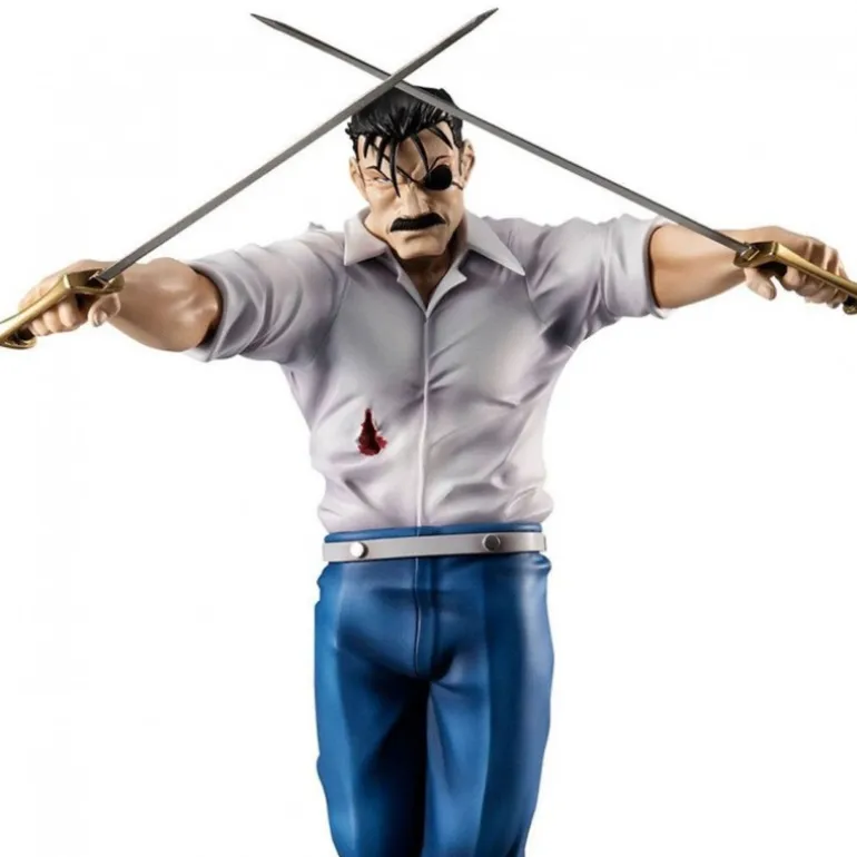 Bradley está representado con su icónica camisa blanca, manchada de rojo en el torso, y pantalones azules, listo para la batalla con dos espadas cruzadas en sus manos. Una pieza de coleccionista ideal para los amantes del anime y de este clásico personaje. Completa tu colección con esta figura oficialmente licenciada, que es perfecta tanto para exhibir como para regalar a un verdadero fan de Fullmetal Alchemist.