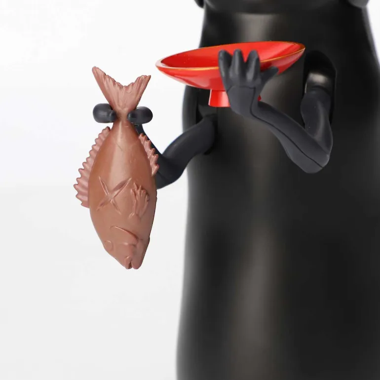 Se trata de una figura de unos 21cm con un mecanismo genial en el que si le dejas unas monedas en el platito, las detecta y se las traga mientras hace sonidos y música. Las monedas pasan a un pequeño compartimento que tiene acceso por detrás y tambien hace como que se come lo que lleva en la otra mano, en la que podrás intercambiar un señor rana o un pescaito frito. Es una super hucha.