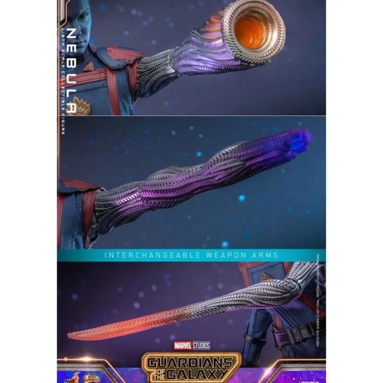 El diseño presenta a Nebula en su emblemático traje azul con detalles en tonos violetas y rojos. Sus accesorios, que incluyen su emblemático brazo biónico y sus distintivas herramientas de combate, hacen de esta figura una pieza única y versátil. La figura está diseñada para ofrecer múltiples poses, lo que la convierte en un excelente elemento de exposición.