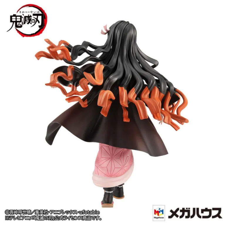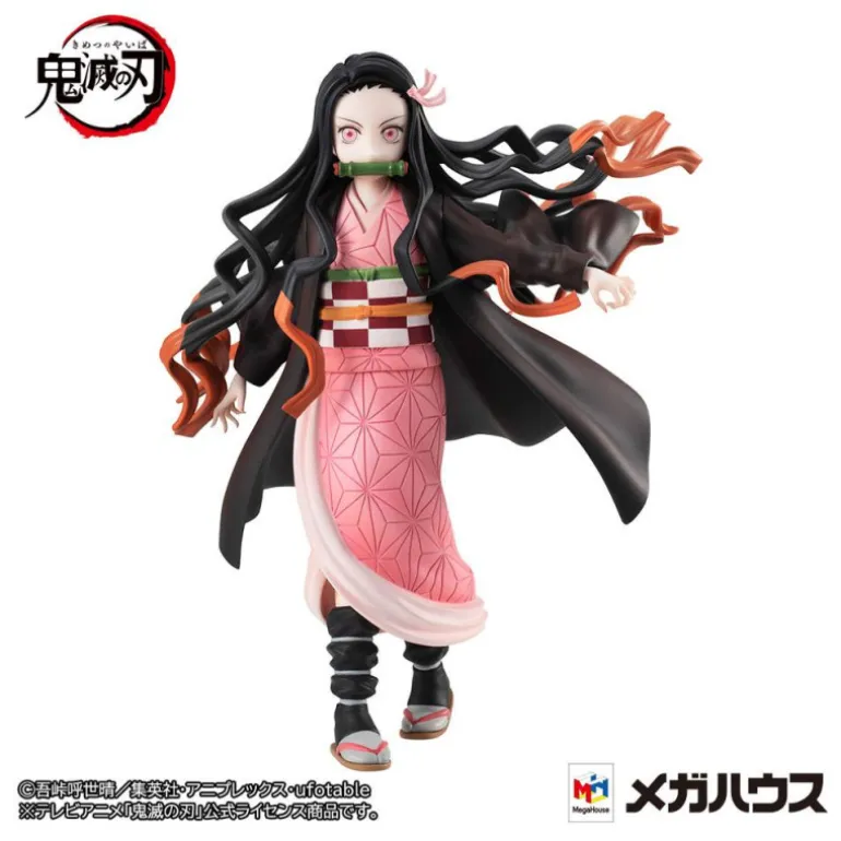 Está fabricada bajo licencia oficial en PVC, tiene una altura de 18 cm. aproximadamente y en ella podemos ver a Nezuko Kamado, la humana convertida en demonio por Muzan Kibutsuji con su característico kimono rosa, el pelo negro y naranja ondeando al viento y el inconfundible bozal de bambú que le regaló Giyu Tomioka.