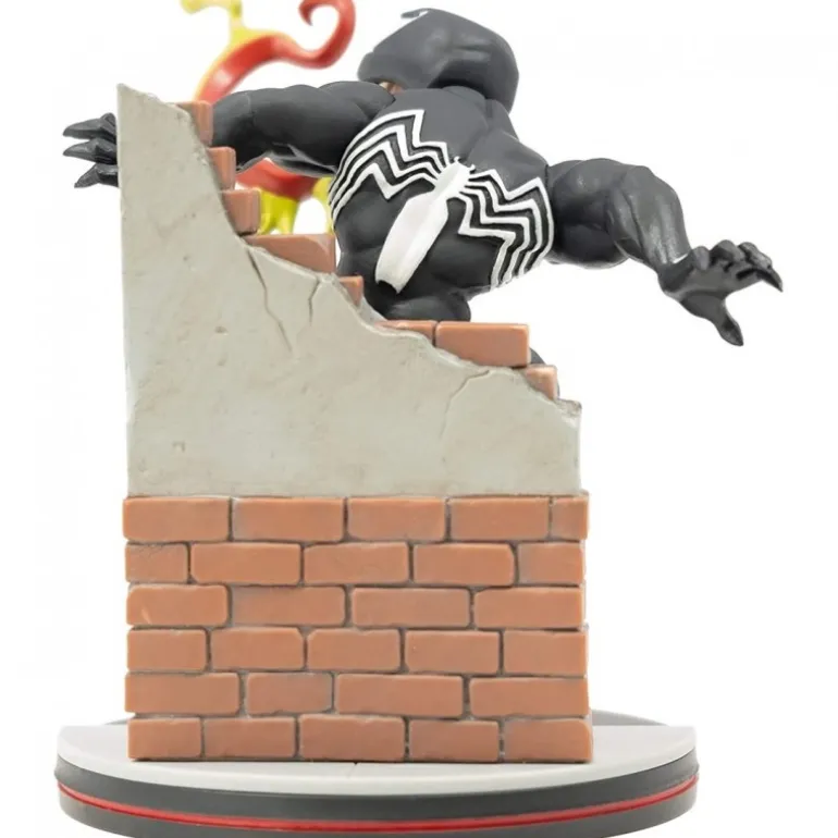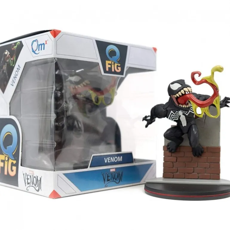 La línea de figuras Q-Fig de Quantum Mechanix presenta esta impresionante representación de Venom. La figura muestra al simbionte en su pose característica, aferrándose a una pared de ladrillos mientras su lengua serpentea con una mezcla de rojo y amarillo. Los detalles son excepcionales, resaltando su musculatura asimétrica y el icónico logo en su pecho. La base diorama no solo proporciona estabilidad, sino que también añade un nivel de detalle que transforma esta pieza en una obra de arte en miniatura. Con una altura de 10 cm, es perfecta para los fanáticos de Marvel que buscan añadir un toque único a su colección.