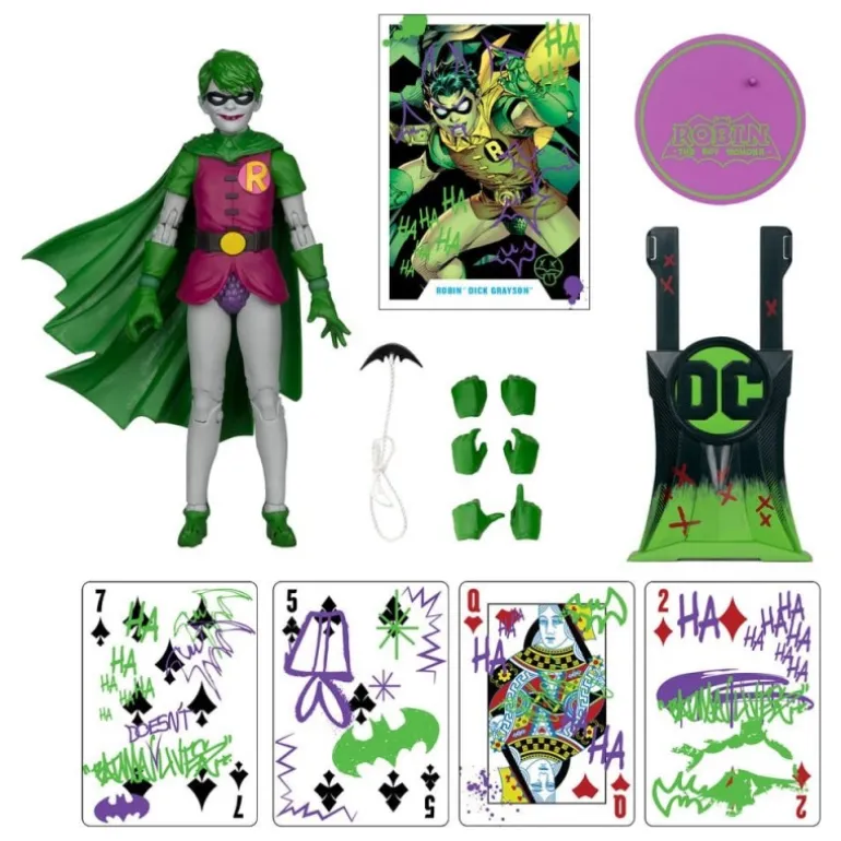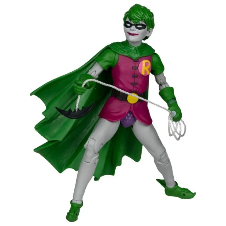 Descubre la impresionante Figura Robin (Dick Grayson) Jokerized de la colección DC Multiverse, una pieza única que no puede faltar en la colección de cualquier aficionado al universo de DC. Esta figura de aproximadamente 18 cm presenta un diseño detallado y llamativo, con colores vivos que resaltan la transformación ‘Jokerized’ del querido personaje.