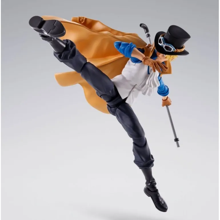 La figura presenta a Sabo con su distintivo atuendo compuesto por una chaqueta azul y un chaleco blanco, complementado con un elegante sombrero de copa negro y gafas en el mismo estilo. Su capa ocre, junto con los pantalones oscuros y las botas negras, aportan un toque dinámico y heroico.