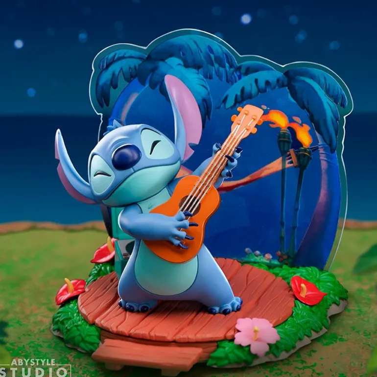 El diseño de la figura captura de manera excepcional la esencia del personaje Stitch, conocido por su carisma y travesuras en la película «Lilo & Stitch«. Con un ukelele en mano, y en una pose que evoca el icónico estilo de Elvis Presley al tocar la guitarra, esta figura no solo es un homenaje al personaje, sino también a la música que ha marcado generaciones. La atención al detalle, desde la expresión facial hasta la postura dinámica de Stitch, hace que esta figura sea verdaderamente única. Además, resulta encantador imaginar a Stitch rodeado de sus canciones favoritas sonando en un vinilo tras él.