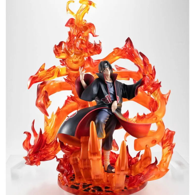 Forma parte de la línea G.E.M., unas figuras a escala 1:8 fabricadas en PVC bajo licencia oficial con un cuidado diseño que reproduce fielmente a nuestros personajes favoritos. En ésta ocasión tenemos a Uchiha Itachi en su versión Susano, con su característico atuendo de color negro y rojo, sobre una impresionante base con diorama repleta de llamas de dragón. Éste modelo tiene una altura aproximada de 38 cm. y está magistralmente finalizado y pintado a mano.