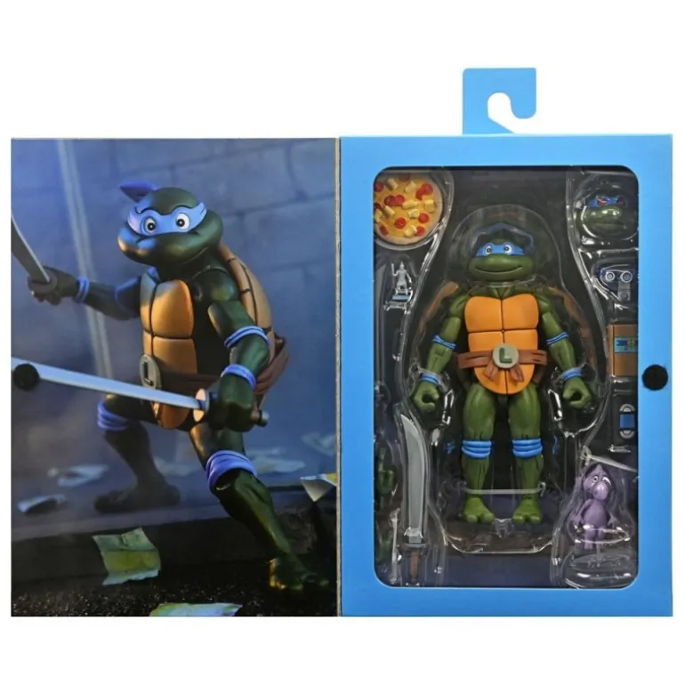 Sumérgete en el mundo de las Tortugas Ninja con esta impresionante figura de Leonardo. Esta figura articulada, de aproximadamente 18 cm de altura, captura a la perfección al líder del grupo en todo su esplendor. El diseño visual está inspirado en el clásico estilo de los años 80, evocando recuerdos de la emblemática serie. Leonardo está representado con su característica máscara azul, empuñando sus icónicas katanas gemelas, preparado para la acción.