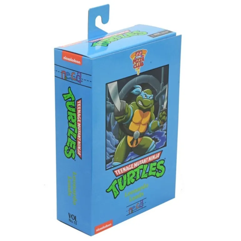 La figura se presenta en una caja con ventana, que rememora el diseño de un VHS antiguo, haciendo que sea un perfecto artículo de exposición para coleccionistas. Además, incluye diversos accesorios que amplían las posibilidades de pose y juego, como una porción de pizza, manos intercambiables y sus emblemáticas espadas. El embalaje está bellamente ilustrado con gráficos vibrantes que capturan la esencia del personaje y su entorno urbano.