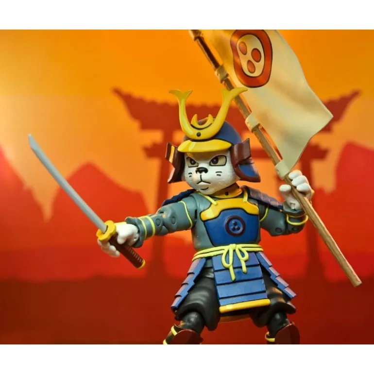 La figura destaca por su detallada armadura samurái en tonos azul y amarillo, combinada con detalles en marrón y un emblema distintivo en el pecho. Su expresiva cara refleja la audacia y valentía de Usagi Yojimbo, mientras que su arsenal de armas asegura que esté siempre listo para la acción.