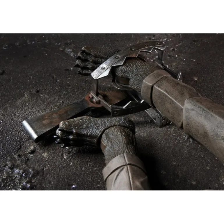 El diseño de la figura es meticuloso, con un detalle excepcional en su apariencia feroz y realista. Viste una camisa verde oscura y pantalones marrones, que contrastan con su característico pelaje marrón oscuro en la cabeza y manos. Sus expresiones y posición corporal capturan la esencia de este clásico monstruo del cine, haciendo de esta pieza un tesoro imprescindible para cualquier coleccionista.