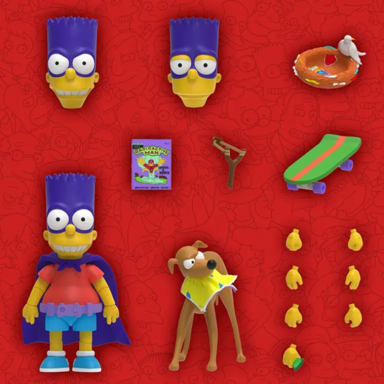 Aquí tenemos a Bart Simpson en su alter ego superhéroe como The Bartman con muchos accesorios: viene con varias cabezas para poder dotar a esta figura articulada de diversas emociones, varias manos, para las poses, su monopatín, su tirachinas, el cinturón por el que empieza esta locura, una capa, el número 1 de Radioactivoman, a Ayudante de Santa Claus comiendose el cómic y el nido de pájaro con el cómic usado como material para su construcción.