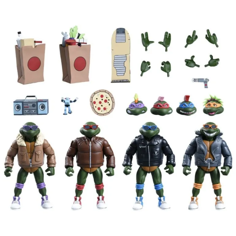 El set incluye una variedad de accesorios, como cabezas intercambiables, piezas de mano y objetos icónicos como una pizza y un radio cassette. Todo viene empaquetado en una caja con ventana, perfecta para exhibir y proteger tu colección. Con dimensiones de 23,8 x 48,7 x 7,7 cm y un peso de 1,045 kg, este conjunto es un must-have para cualquier fan de las Tortugas Ninja y coleccionistas de figuras de acción.