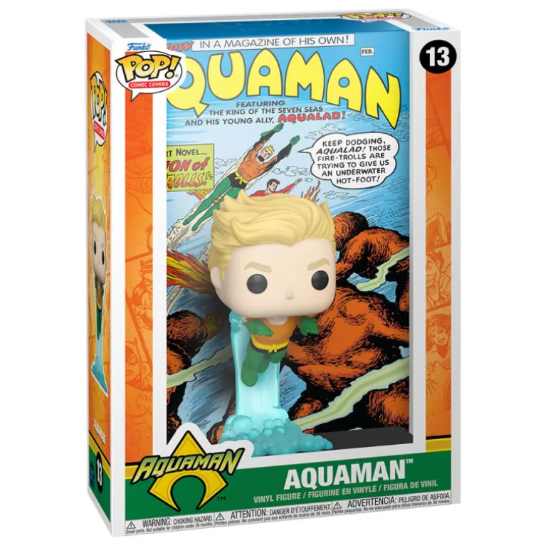 En esta ocasión Funko nos sorprende con los Funko Pop! Comic Cover, su particular homenaje a algunas de las portadas de comics más emblemáticos del mundo Marvel. Y aquí tenemos una figurita inspirada en un comic vintage de Aquaman, con la figura de ese personaje que protagoniza la portada, y la propia portada en el fondo de la caja.