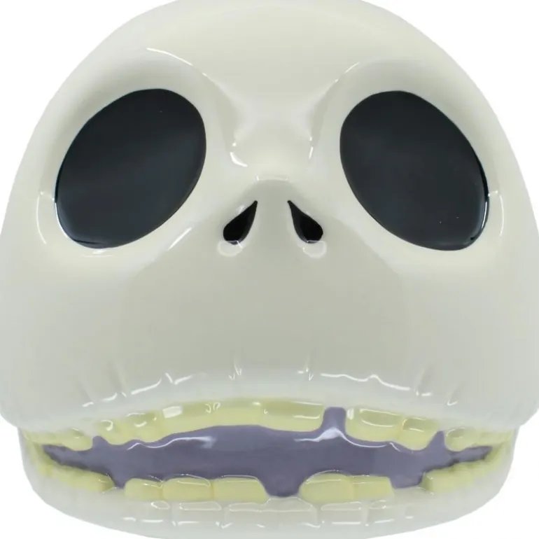 Descubre el galletero de cerámica Jack Skellington inspirado en la icónica película Pesadilla Antes de Navidad. Este galletero es un producto con licencia oficial, ideal para los fanáticos del universo mágico de Tim Burton. Con su diseño único, presenta la inconfundible cara de Jack Skellington, con detalles en negro para sus ojos y nariz, y una amplia sonrisa que lo hace lucir amigable y divertido.
