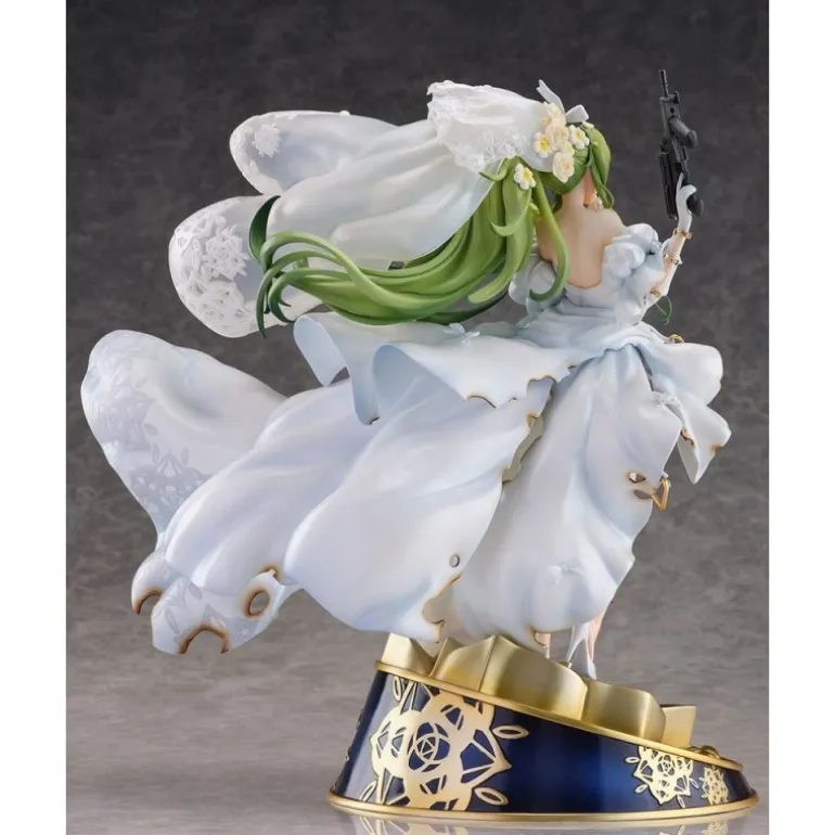 Con unas dimensiones aproximadas de 29 cm de altura, la estatua captura la esencia del personaje con su elegante vestido blanco decorado con detalles dorados y encajes, junto con su largo cabello verde que fluye de manera realista. Cada elemento, desde las texturas del vestido hasta la postura dinámica, refleja la calidad y el cuidado en el diseño.