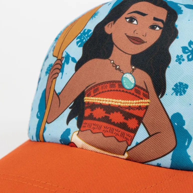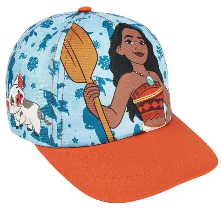 El diseño en tonos turquesa presenta a Moana, la intrépida heroína del océano, empoderando a los niños a explorar su propia imaginación. La gorra cuenta con un fondo de color azul claro salpicado de gráficos tropicales, lo que la convierte en una pieza divertida y alegre. La visera en color naranja añade un contraste vibrante, resaltando aún más el diseño.