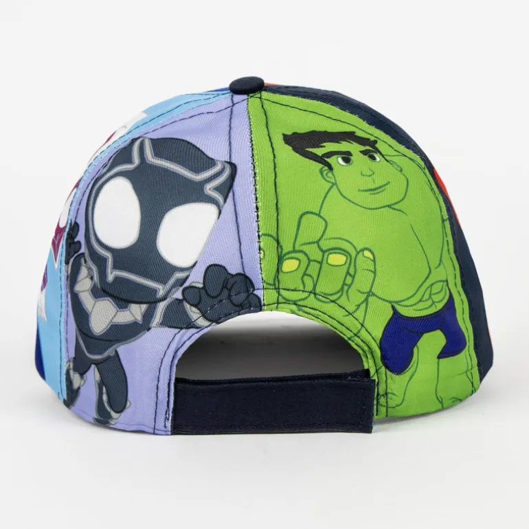 El diseño vibrante presenta a icónicos personajes como Spider-Man e Iron Man, lo que la convierte en una opción perfecta para los amantes del universo de los superhéroes. La gorra destaca por sus llamativos colores, incluyendo un fondo azul oscuro que realza las ilustraciones en tonos rojo y amarillo. Con un tamaño de 53 cm, se ajusta perfectamente a la cabeza de los más pequeños, asegurando un uso cómodo durante todo el día.