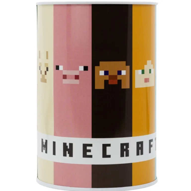 Una hucha genial cuyo diseño está dedicado al videojuego Minecraft, con varios elementos del juego sintetizados de una forma super elegante y colorida, uno representa un creeper,otro un enderman, otro una espada de diamante, otro un esqueleto…