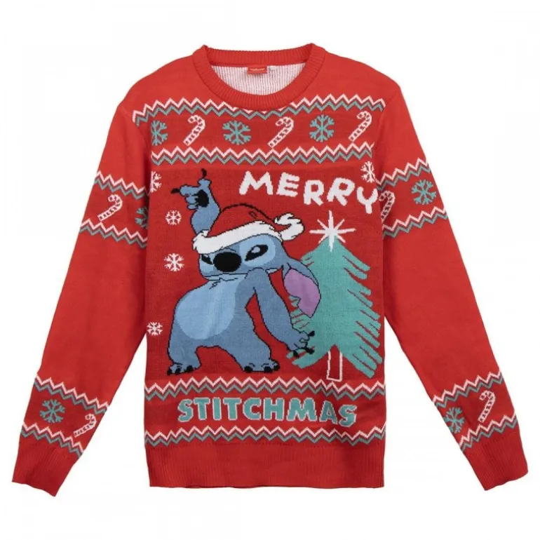 Este encantador jersey de punto navideño es perfecto para celebrar las fiestas con estilo y un toque de diversión. En un vibrante color rojo, este jersey presenta un diseño festivo con Stich, el querido personaje, llevando un gorro de Papá Noel junto a un árbol navideño. El texto «Merry Stitchmas» añade un toque humorístico único.