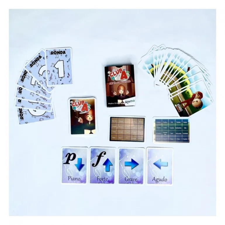 La caja muestra una ilustración atractiva de una joven directora de orquesta con el logo de Club A, destacando su enfoque educativo. Las cartas vienen con diseños coloridos y claros que facilitan la identificación de músicos e instrumentos, fomentando el aprendizaje visual y la colaboración entre los jugadores.