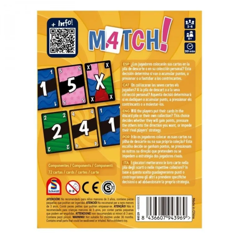 La interacción es clave: desafía a tus amigos, fuerza su mano y conviértete en el vencedor. Con su formato compacto, el Juego de cartas Match! es un regalo ideal y una excelente adición a cualquier colección de juegos.