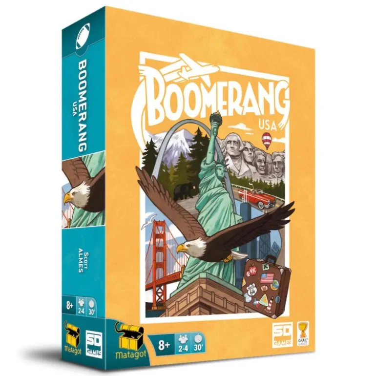 ¡Embárcate en una emocionante aventura con el juego de mesa Boomerang: USA! Ideal para niños a partir de 8 años, este juego desafía a los jugadores a seleccionar y pasar cartas mientras anotan sus logros de viaje en el bloc de puntuación. Con un diseño vibrante que muestra icónicos monumentos de los Estados Unidos en su caja, como la Estatua de la Libertad y el Monte Rushmore, este juego es tanto educativo como entretenido.
