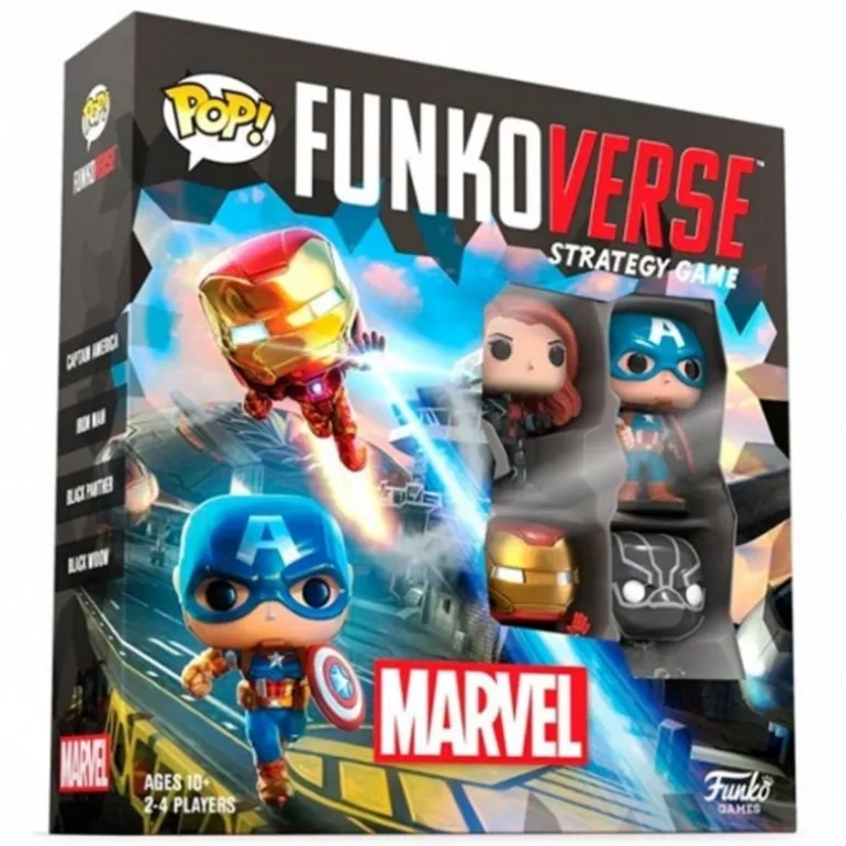Sumérgete en el universo de los superhéroes Marvel con el juego de mesa FUNKOVERSE. Esta edición incluye las icónicas figuras de Capitán América, Iron Man, Viuda Negra y Pantera Negra. Diseñado para 2 a 4 jugadores mayores de 10 años, ofrece partidas de entre 20 y 60 minutos.
