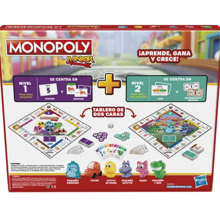 Descubre la diversión del Monopoly Junior, un juego de mesa de Hasbro diseñado para fomentar el aprendizaje y la diversión de los niños. Este juego incluye un tablero de doble cara que ofrece dos niveles de desafío. El Nivel 1, recomendado para niños de 4-5 años, ayuda a contar y asociar mediante la compra de propiedades y el conteo de casillas. En el Nivel 2, pensado para niños de 6 años en adelante, los pequeños se centran en la lectura y las matemáticas básicas. ¡El jugador con más dinero será el ganador!