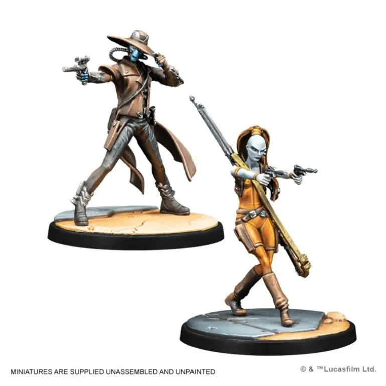 Las miniaturas representan a Cad Bane, conocido por sus rápidas pistolas bláster y trucos imprevisibles, y a Aurra Sing, una francotiradora famosa por su crueldad. Perfecto para coleccionistas y amantes de Star Wars, este producto con licencia oficial te sumerge en batallas tácticas mientras respetas su esencia. Ideal para sesiones de juego de 90 minutos, este juego es apto para 2 jugadores a partir de los 14 años.