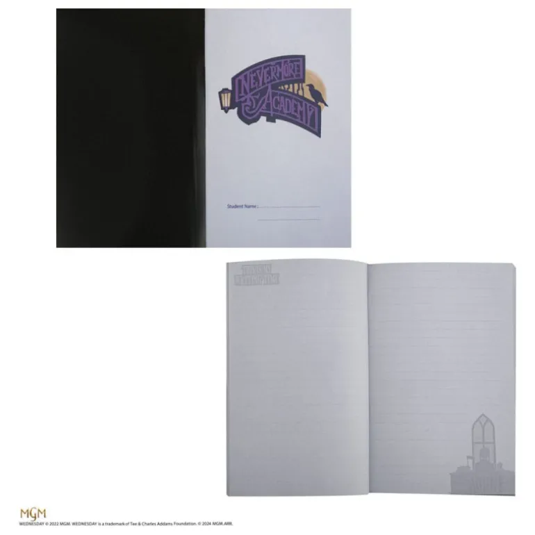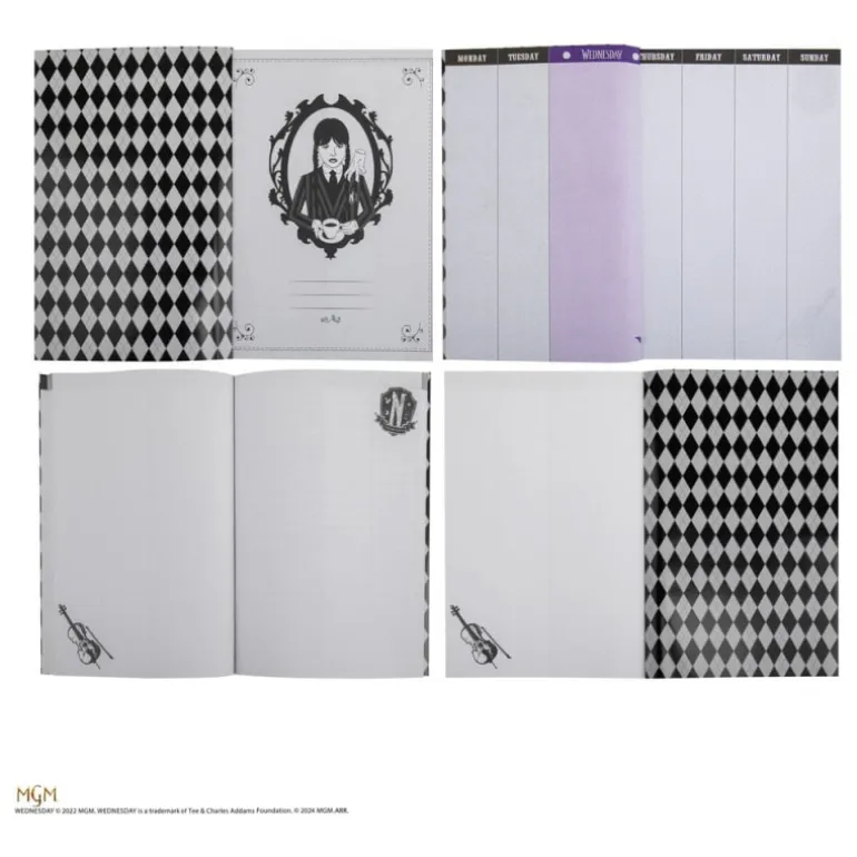 - Cuaderno: Diseño en blanco y negro con un patrón de rombos y una ilustración de Miércoles en la portada, sobre un fondo negro que resalta su silueta.
