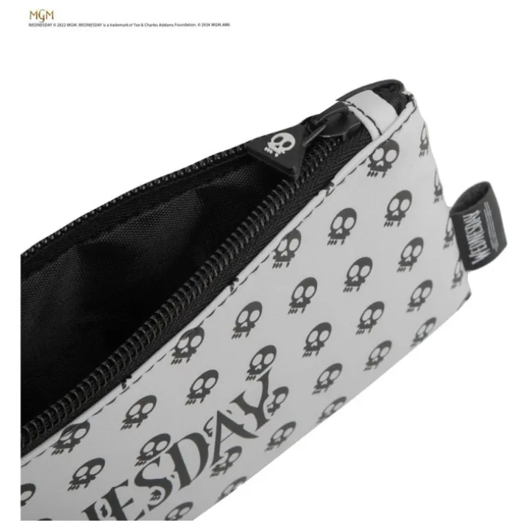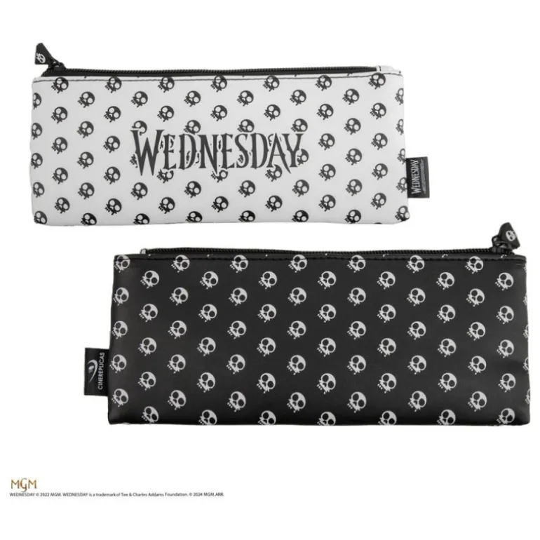 - Estuche: Disponible en blanco con estampado de calaveras y el texto «Wednesday», ideal para guardar todos tus artículos de papelería. Su cierre de cremallera asegura que todo esté bien guardado.