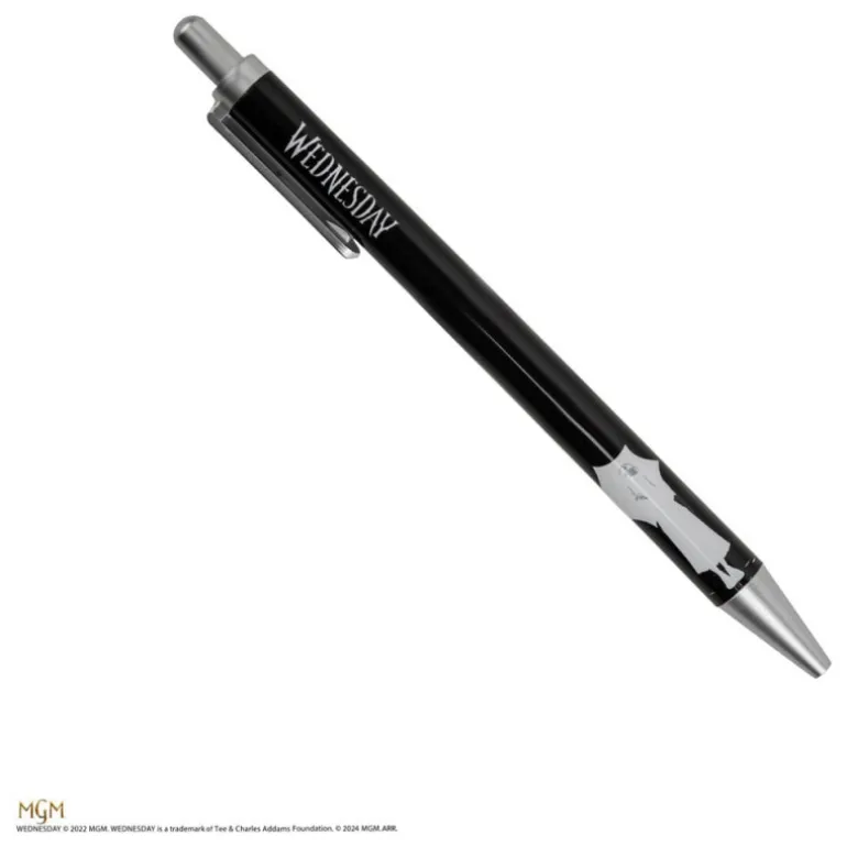 - Bolígrafo: De color negro con detalles en plata y el nombre «Wednesday», ofrece una escritura suave y estilizada.