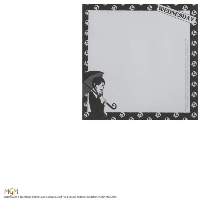 - Bloc de notas adhesivas: Decorado con motivos de calaveras y una ilustración de Miércoles con un paraguas, perfecto para anotar tus pensamientos más oscuros.