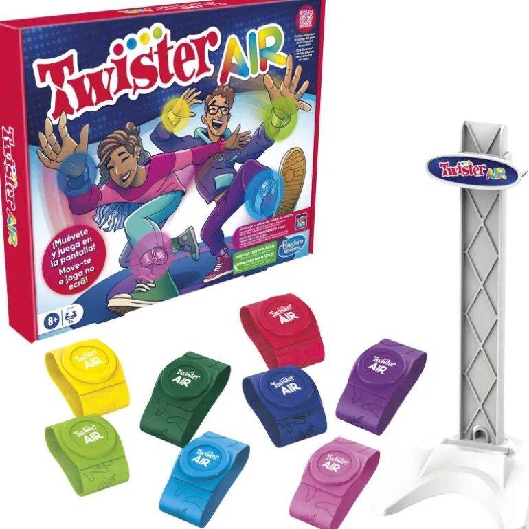 ¡Lleva la diversión de Twister a un nuevo nivel con Twister Air! Este emocionante juego de realidad aumentada de Hasbro permite a los jugadores trasladar sus movimientos del tapete a la pantalla sin necesidad de uno físico. Incluye 8 bandas de colores y un soporte para dispositivos móviles o tabletas.