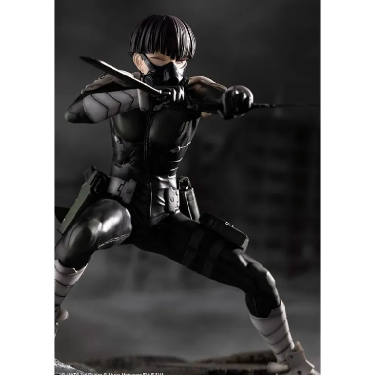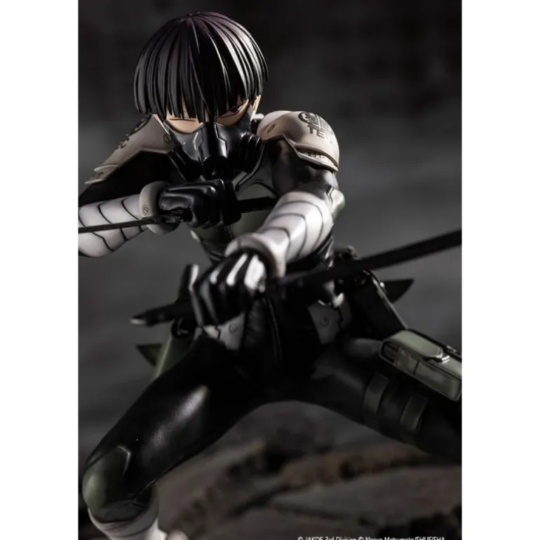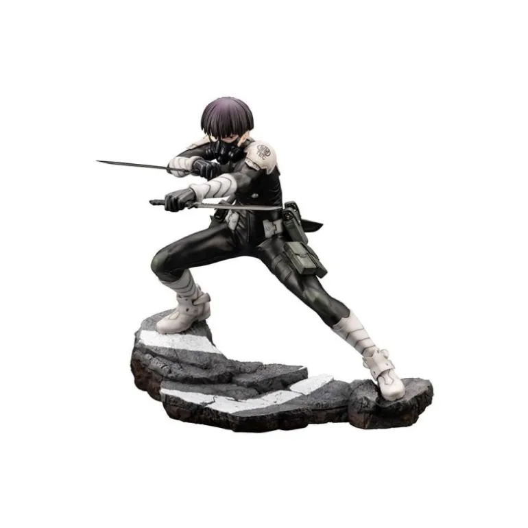 El diseño meticuloso resalta a Hoshina con su atuendo distintivo, combinando tonos oscuros con detalles en gris y blanco. La figura muestra el personaje preparado para el combate con dos katanas, destacando su determinación y habilidad. Fabricada por Kotobukiya, esta estatua de PVC destaca por su calidad y realismo, desde las texturas de la ropa hasta la base que simula terreno pedregoso.