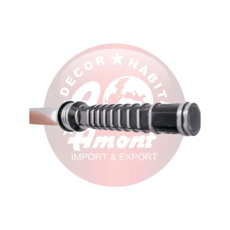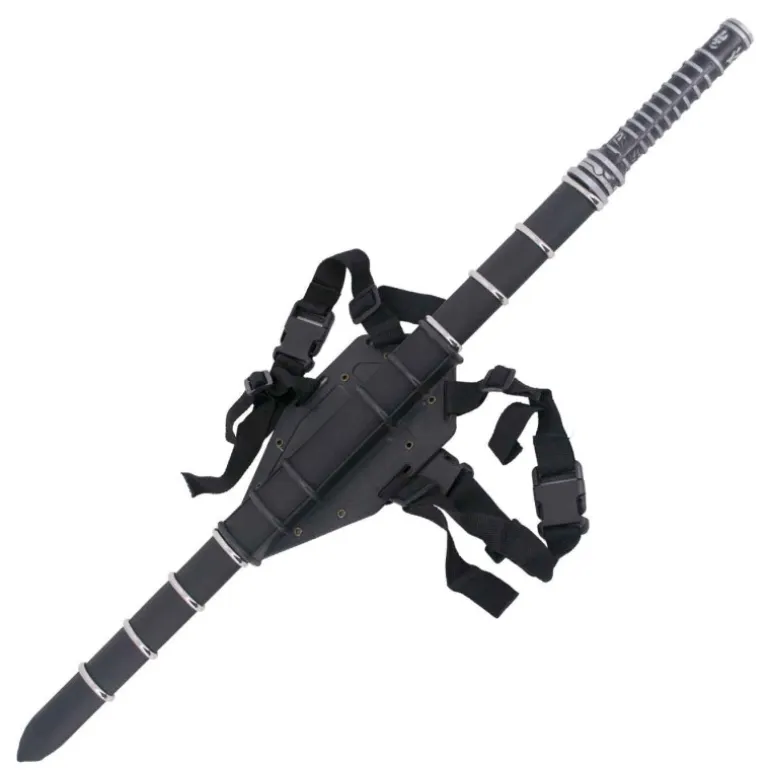 Se trata de una katana ornamental de gran calidad que mide en total 93,5 cm, viene además con un arnés para llevarla a la espalda como el mismísimo Blade. Su hoja es de acero con una vaina negra de curpiel con anillas plateadas y el mango metálico. Fíjate bien en las fotos para que puedas apreciar bien todos esos detalles y ornamentos.