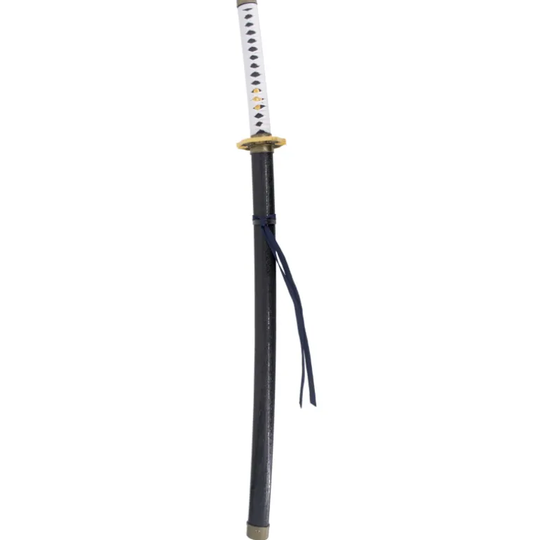 Es una réplica de la espada que mide un total de 101 cm y con la hoja de bambú en azul y gris, mango con encordado blanco.
