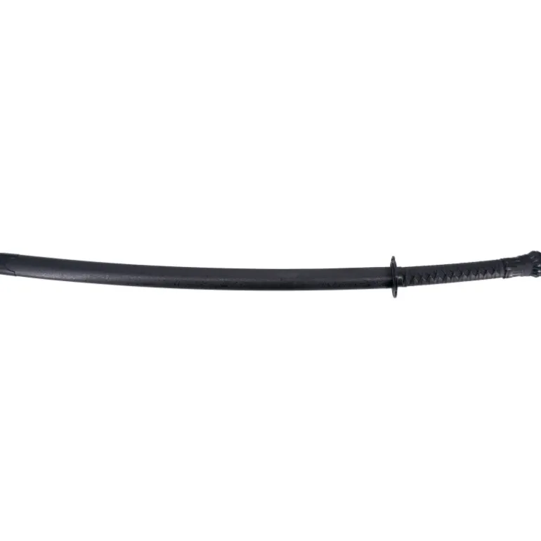 Esta katana está hecha con una hoja de acero negra de 69 cm de largo y un grosor de 4,4 mm, adornada con detalles blancos, lo que la hace aún más impactante visualmente.La espada se entrega sin filo, aunque no debe en ningún caso dejarse al alcance de los niños.