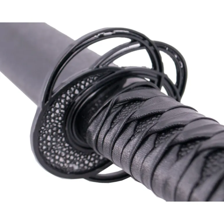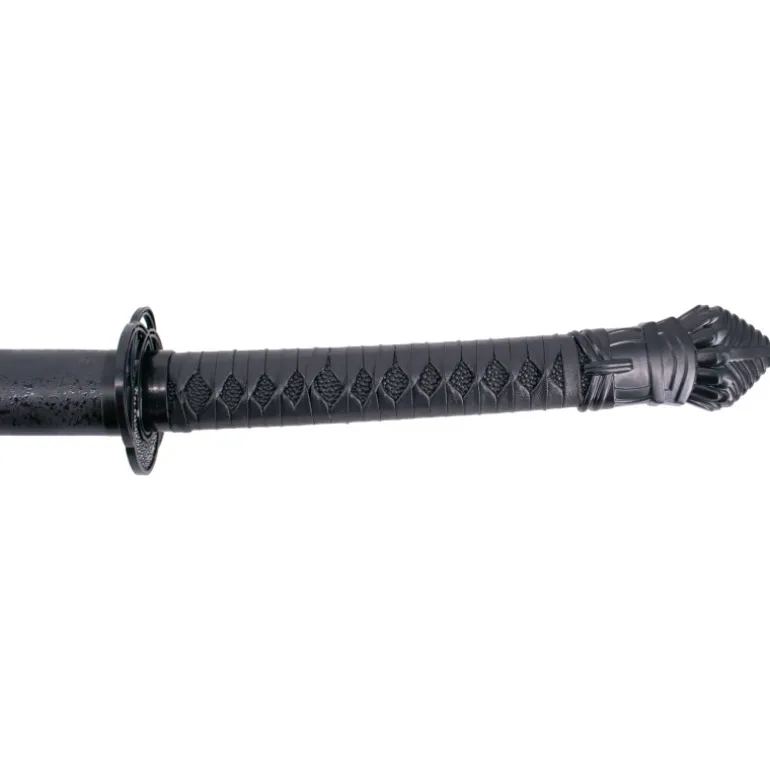 El mango encordado de polipiel negra le da un aspecto elegante y un agarre cómodo y seguro. Además, se incluye una vaina negra para proteger y almacenar de manera segura la katana. Incluida en la compra, se incluye también un soporte expositor para mostrar esta pieza de colección de manera elegante y orgullosa.