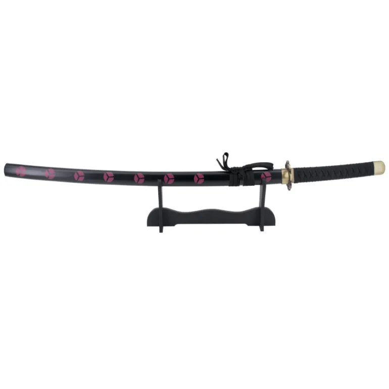 Es una réplica de la espada Shusui que lleva Zoro durante los episodios que mide un total de 100 cm y con la hoja de acero negra sin filo con dentado en rojo, mango con encordado negro con soporte.