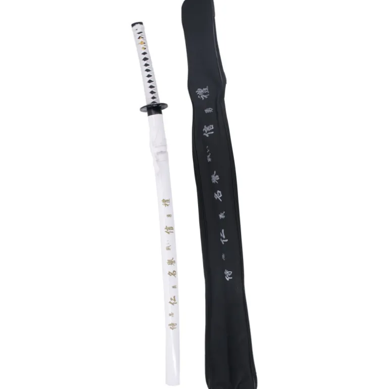 Mide un total de 102 cm y esta fabricada acero. Tiene una vaina blanca con inscripción, hoja de acero sin filo, mango con encordado blanco, con funda de nylon. Fíjate bien en las fotos para ver más detalles que tienen la hoja y la funda.