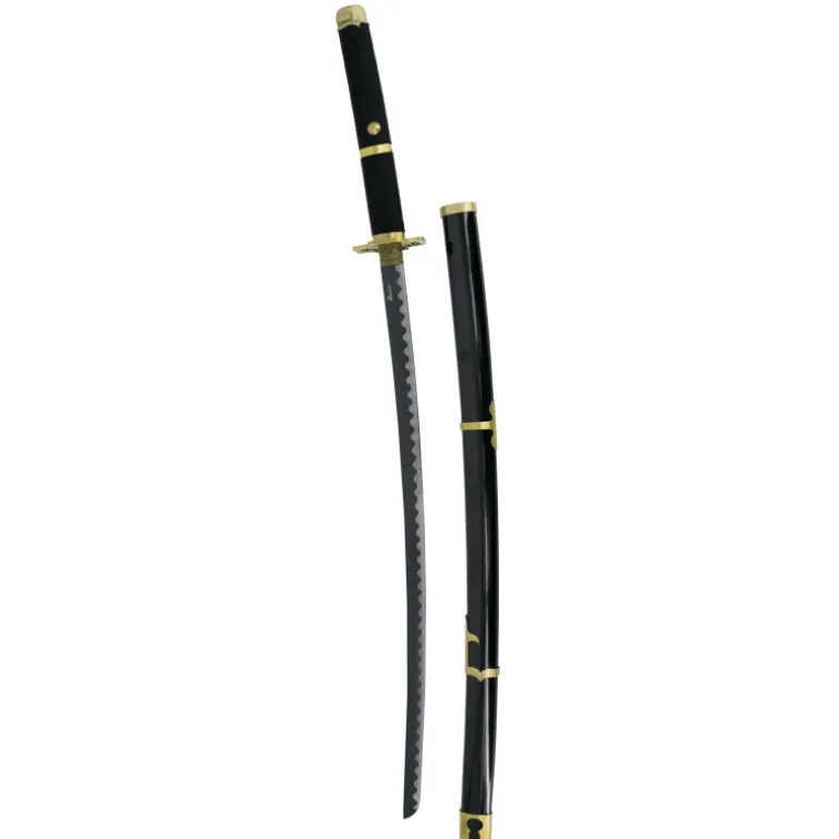 Es una réplica de la espada Yubashiri que lleva Zoro durante los episodios que mide un total de 103 cm y con la hoja de acero sin filo acabado en negro con dentado satinado, mango con encordado negro, con soporte.