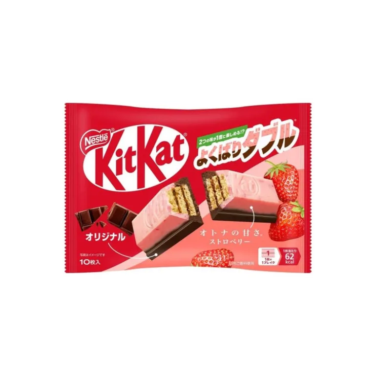 Estos KitKat destacan por su combinación de dos chocolates: uno suave con sabor a fresa y otro intenso de chocolate negro. Esta mezcla se funde en un perfecto equilibrio, ofreciendo una experiencia de sabor única.