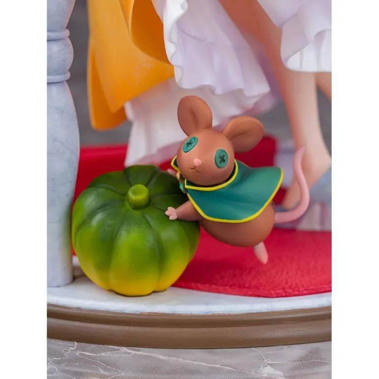 La figura está esculpida con gran precisión, mostrando capas de tela que fluyen a su alrededor y una expresión serena y confiada. La base simula un lujoso suelo de color rojo con detalles en blanco, acompañada de un adorable ratón con una pequeña capa, añadiendo un toque de fantasía al conjunto.