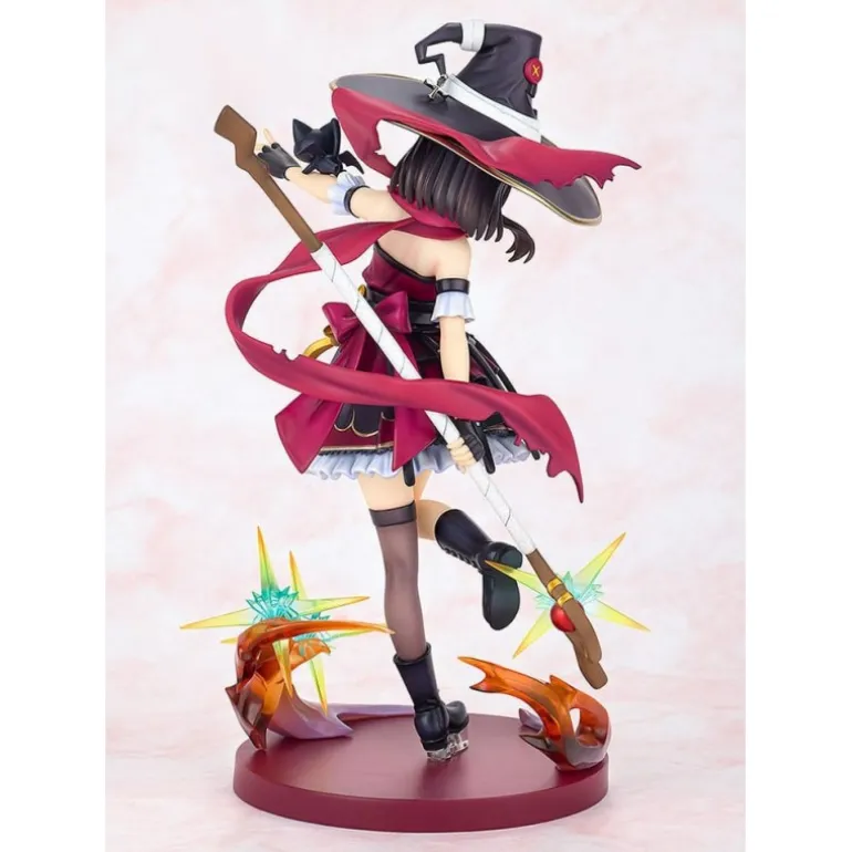 Con una altura aproximada de 18 cm, Megumin se presenta en una pose dinámica, acompañada de su característico sombrero y capa. Los colores vibrantes, combinando tonos de rojo, negro y dorado, resaltan su atuendo mágico. Su base es elegante y añade estabilidad a la figura, garantizando su exposición segura.