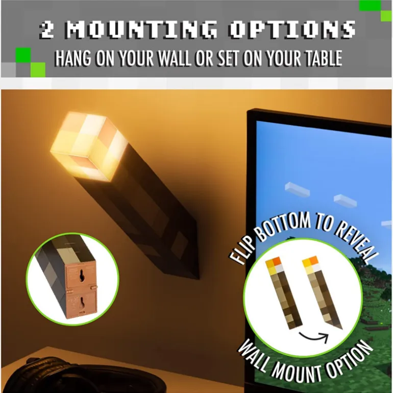 Es una lámpara espectacular que reproduce en 3D una antorcha del Minecraft, igualita a los del juego, con sus píxeles y todo. Cuenta con dos modos de iluminación, uno de luz fija y otro que varia su intensidad como si fuera fuego real. Además, está diseñada de forma que se pueda colocar de pie, sobre una balda o una mesa, pero también lleva una base especial para fijarla a la pared, como si fuese una antorcha de una cueva. Ha sido diseñada y fabricada por la firma Paladone bajo licencia Minecraft, y funciona con tres pilas AAA (no incluidas) o mediante USB. Mide unos 29 cm y proporciona una luz ambiente de lo más chula.