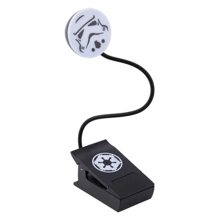Se trata de una de esas pequeñas lamparas con pinza para leer de manera individual, la puedes colocar directamente en el libro o revista que estés leyendo sin molestar a nadie porque es muy focal y al tener el pie de alambre puedes apuntar en la dirección que tu quieras. Funciona con tres pilas AAA que no vienen incluidas y su diseño es muy molón, en este caso con el casco de un Stormtrooper.